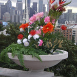 A classic example of Wright’s early prairie style, these planters sit very prominently in front of the Dana-Thomas residence, just a few blocks from the Illinois state capitol building. The original vases are quite large, measuring over 5 1/2 feet in diameter.