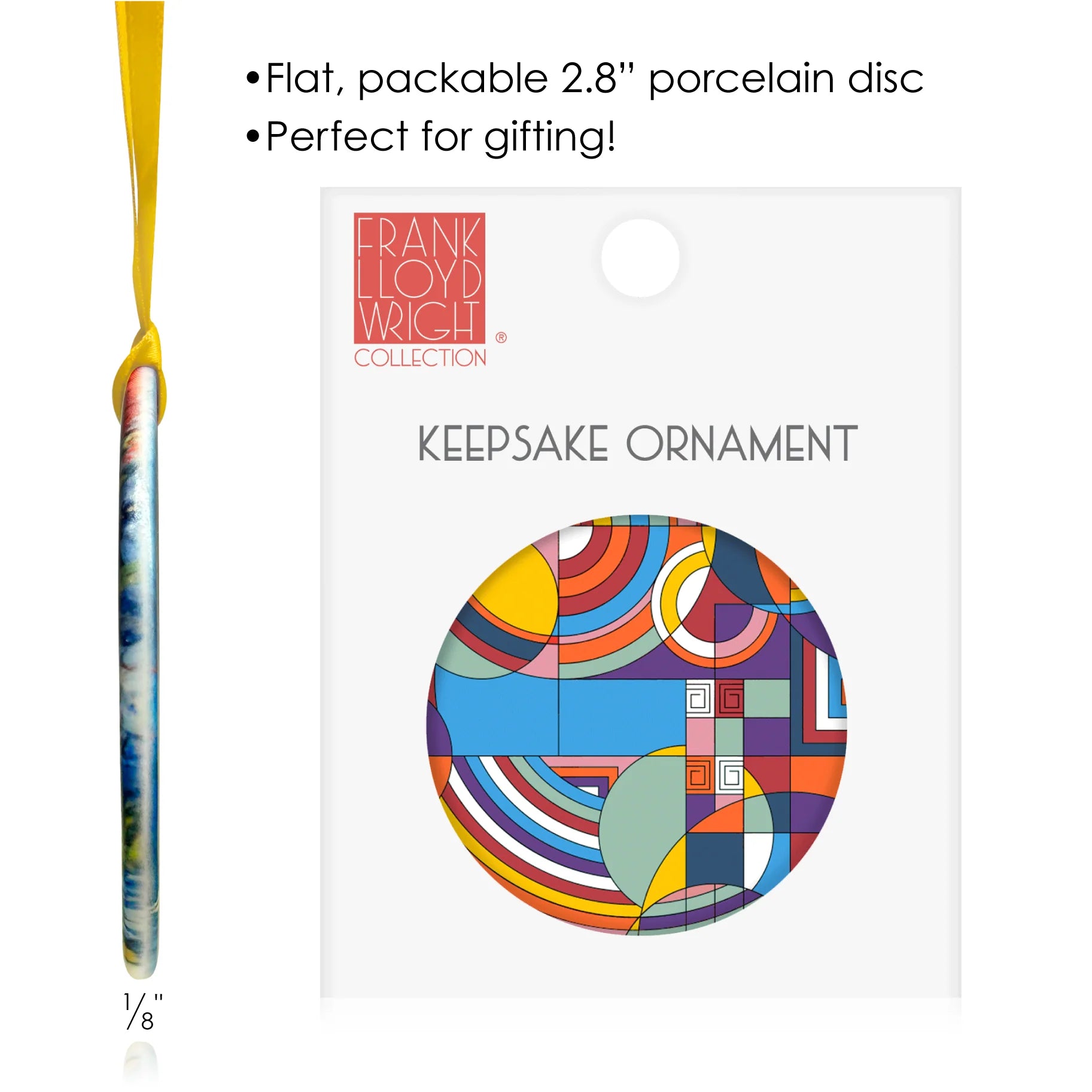 Accent your home with this captivating porcelain keepsake ornament. Our keepsake ornament collection features a series of fine art designs. Beautiful displayed individually or as a group. Experience the artistic brilliance of Frank Lloyd Wright beyond his architectural masterpieces. Explore the intricate world of his drawings, designs, and illustrations that are both functional and artistic. Wright's unique artistic vision, characterized by geometric precision and organic inspiration, is a testament to his creative genius. Discover the beauty of Frank Lloyd Wright's artworks and bring the spirit of innovation and aesthetics into your space. Immerse yourself in the artistic world of this American architectural visionary! The "Hoffman Rug" ornament adds a touch of grandeur to any room.