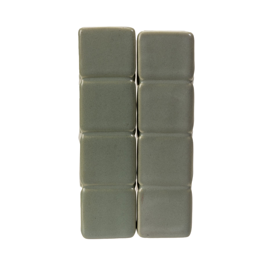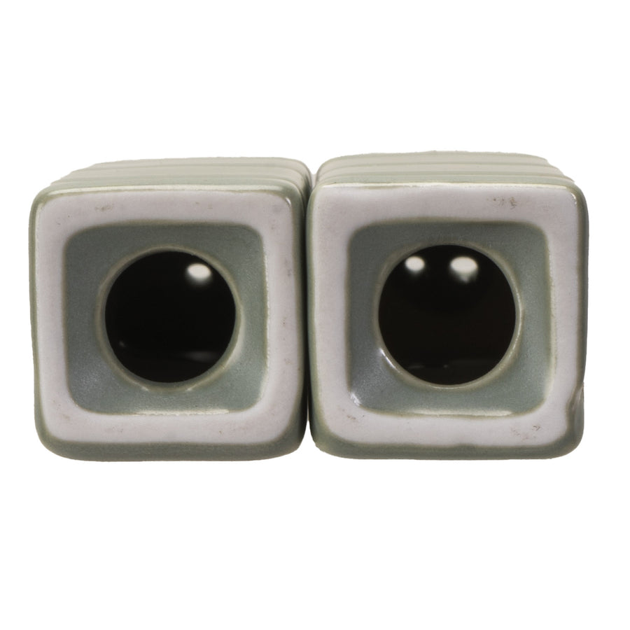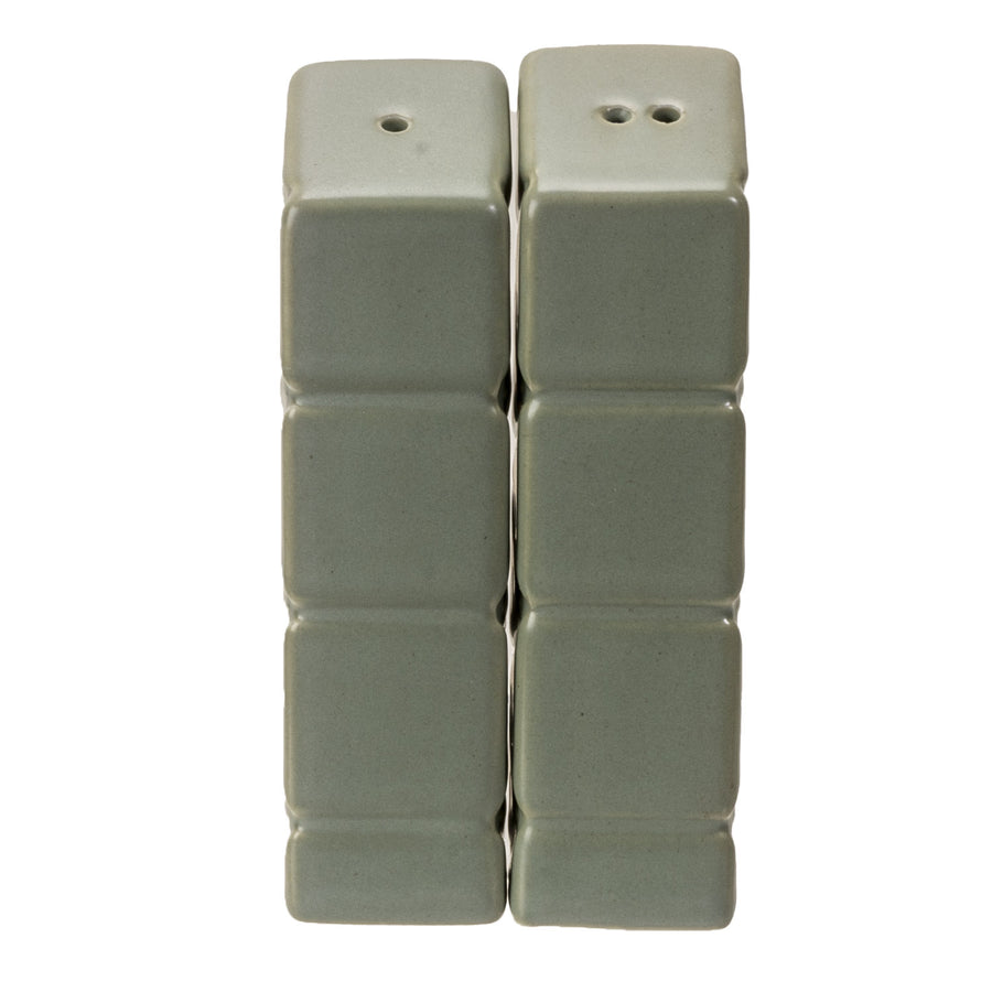 Ceramic salt and pepper shakers with a geometric pattern, presented on a wooden surface.