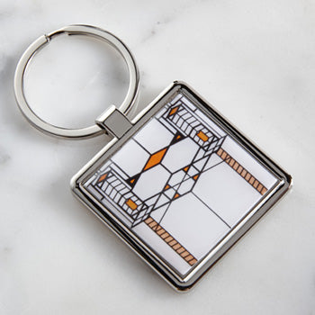Chrome keyring with a detail of a window from Wright's Robie House. 1-3/4" square. Ring is 1-3/8" diameter.