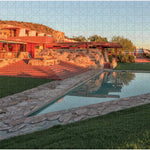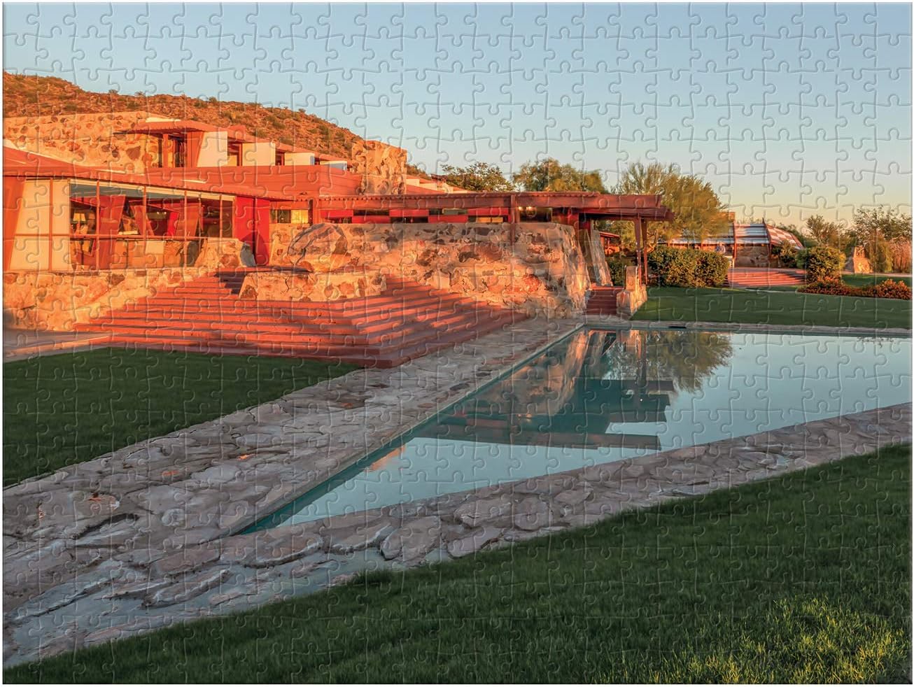 Frank Lloyd Wright is recognized worldwide as one of the greatest architects of the twentieth century. His work heralded a new thinking in architecture, using innovation in design and engineering made possible by newly developed technology and materials. His creative ability extended far beyond the border of architecture to graphic design, furniture design, art glass, textiles, and decorative elements for the home. Stunning photos of both Taliesin and Taliesin West grace each side of this 500 piece double-sided puzzle. One side is matte and the other is glossy for easy sorting.