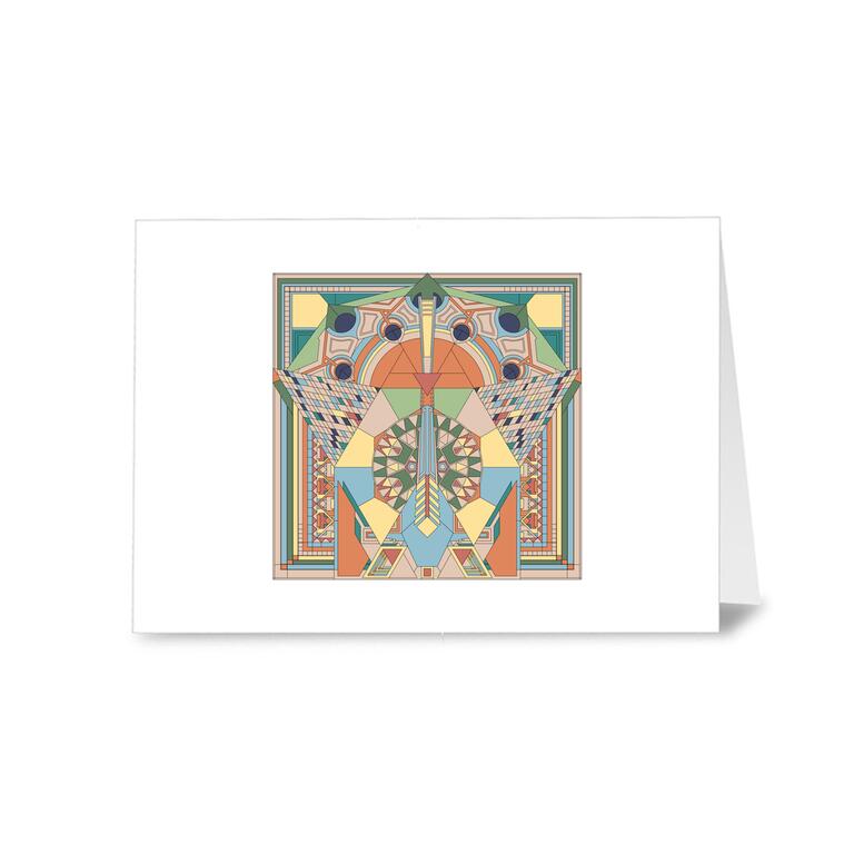 The intricate composition showcases layered geometry and a harmonious palette of warm earth tones, soft blues, and greens, capturing the elegance and innovation that define Wright’s work. Both graphic and ornamental, this card feels timeless yet distinctly modern.
