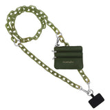 A green Clip & Go chain phone strap with a wristlet and a zippered change pouch attached.