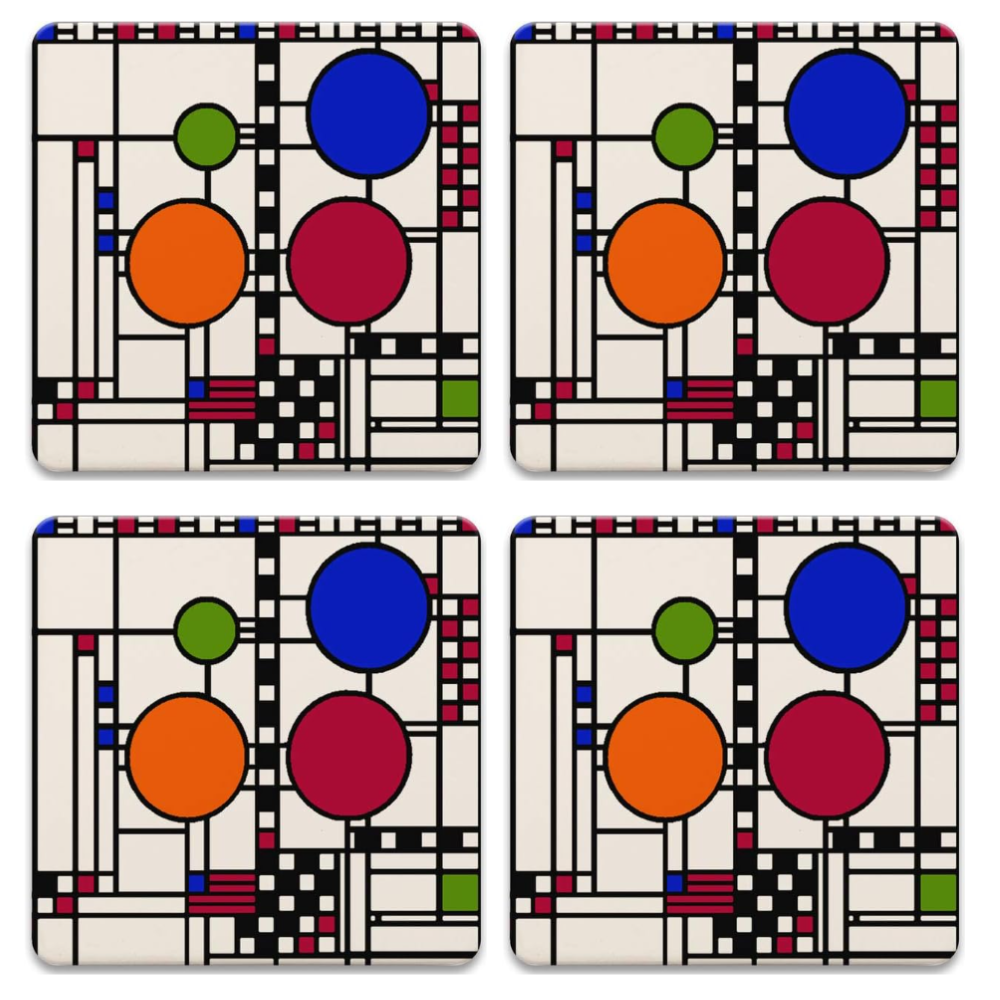 Coasters feature a playful art glass window design from Avery Coonley Playhouse Window (Riverside, Illinois, 1912) created by Frank Lloyd Wright. With asymmetrical geometric designs and suggestions of flags, balloons, and confetti; the brightly colored windows bring to mind a parade.