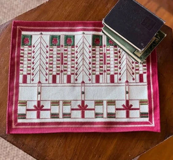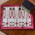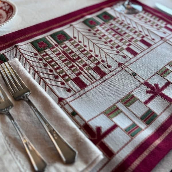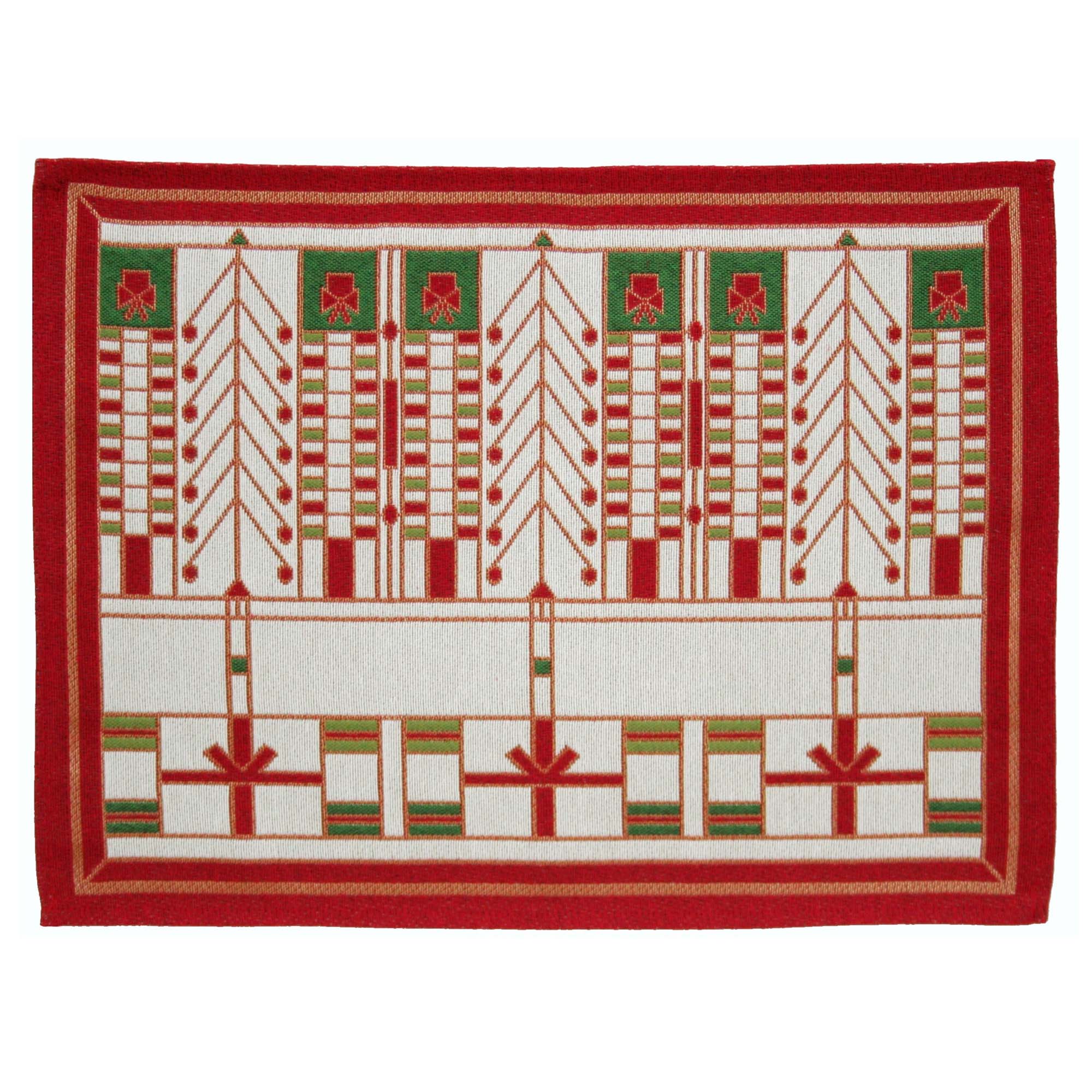 Dress up your holiday table with this festive placemat, a Christmas-inspired version of our Prairie Chevrons design. Stylized trees, bright ornaments, and wrapped gifts come together in a bold, modern pattern woven in cheerful seasonal colors.