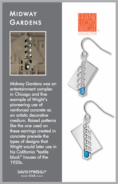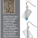 Midway Gardens was an entertainment complex in Chicago and fine example of Wright’s pioneering use of reinforced concrete as an artistic decorative medium. Raised patterns like the one used on these earrings created in concrete precede the types of designs that Wright would later use in his California “textile block” houses of the 1920s.