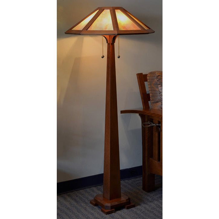 This classic Arts & Crafts style floor lamp is carefully crafted of hand picked quarter-sawn white oak, with genuine amber mica panels in the shade. Four solid brass Edison style electrical sockets accept 2 60-watt max incandescent bulbs or two 100-watt CFC or LED bulbs.