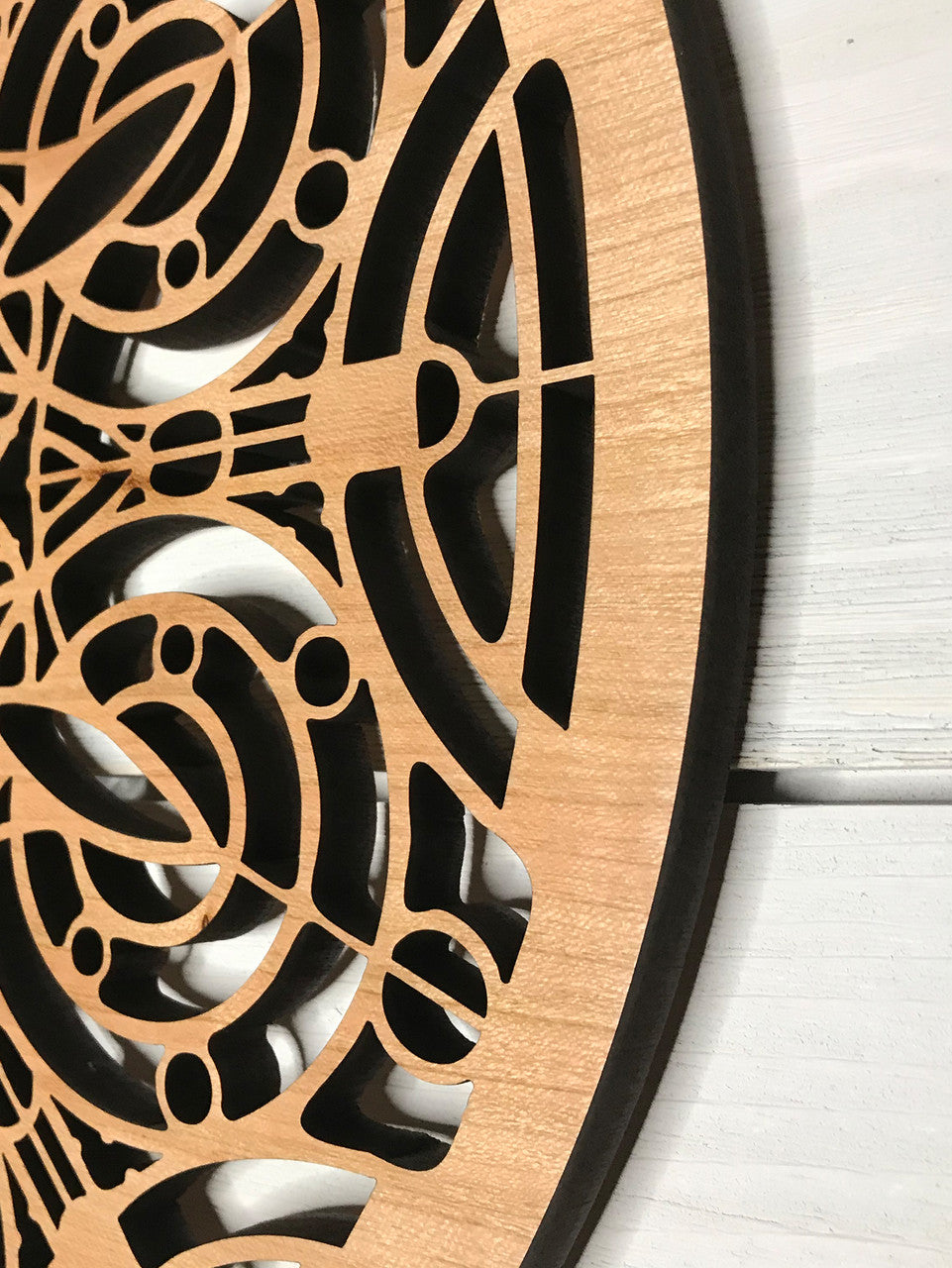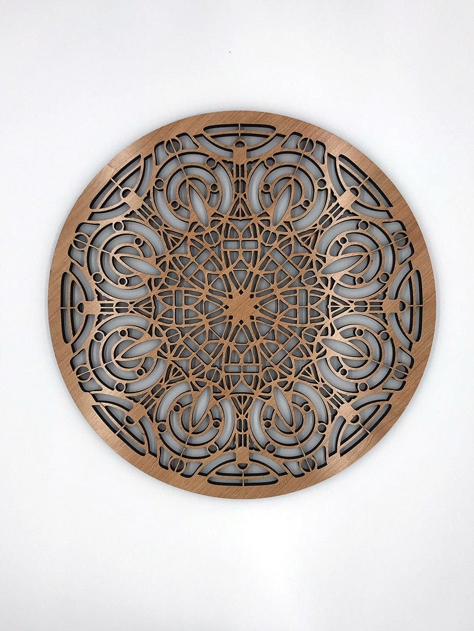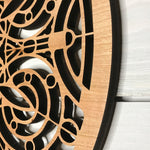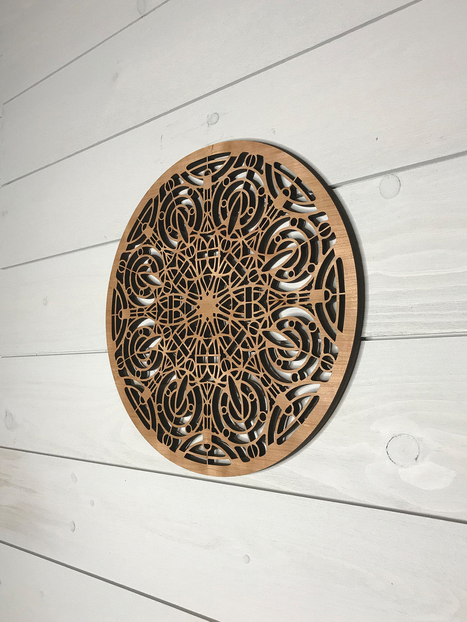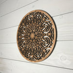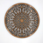 Our medallions and wall elements are made with cherry veneered MDF. This beautiful medallion measures 16" in diameter and 1/2" thick. Includes one sawtooth hanger and hardware. All AlaModerna products are made in the USA.
