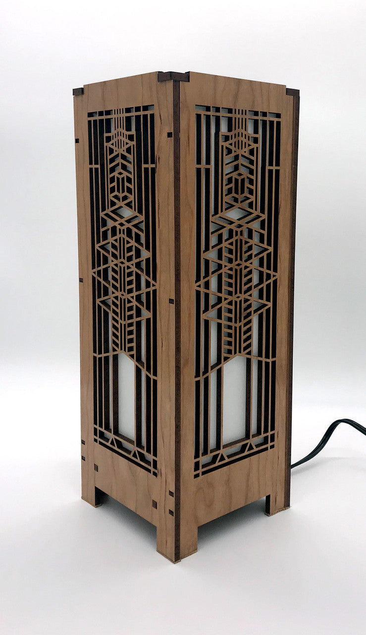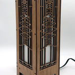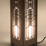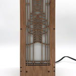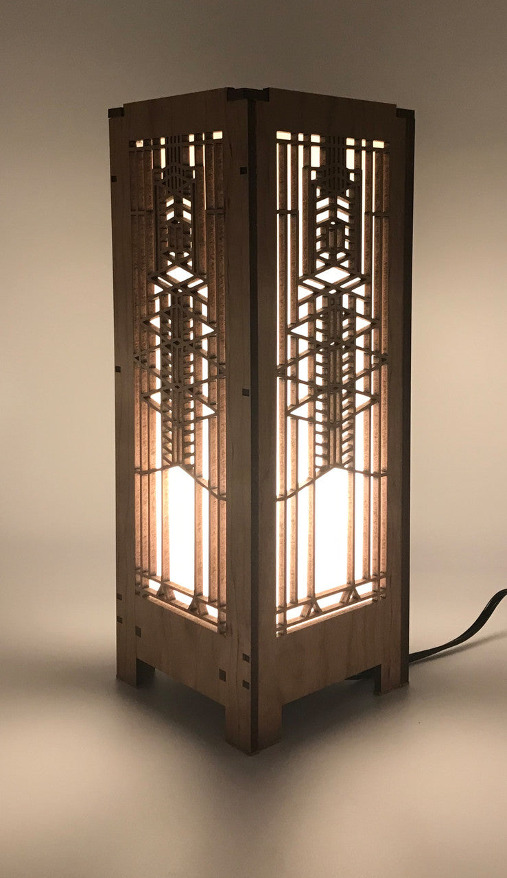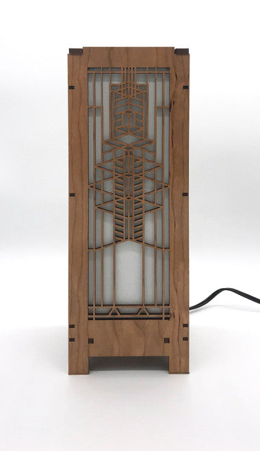Frank Lloyd Wright designed his Prairie style masterpiece, the Frederick C. Robie House in 1908 from his Oak Park Studio. This distinctive structure, which was commissioned by a local engineer, is renowned as a forerunner of modernism in architecture. The American prairie landscape is mirrored in this architectural style by low horizontal design, open interior spaces, and deep cantilevered eaves, made possible by long spans of structural steel framing. The long façade is punctuated by over 170 art glass windows which enhance its openness. The home includes twenty-nine unique glass designs. Their color and delicate geometric diamond and chevron shapes are abstractions of the surrounding Midwest foliage and grain shafts. Lightbox is made with cherry veneered MDF and heat resistant shoji paper. Each lightbox includes an inline on/off switch on an 8' cord. The candelabra base includes a 4.5 watt LED tubular bulb. This lightbox measures 5-1/2" square x 11-1/2". Made in the USA.
