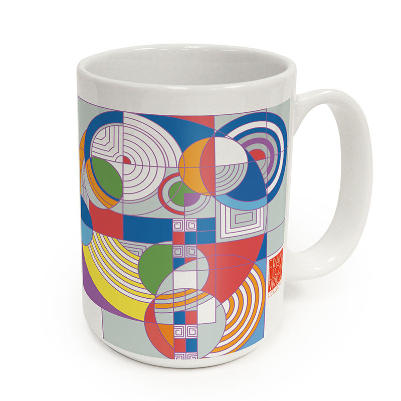 The coffee mug design is adapted from a carpet design proposed for the living room of the Hoffman home, featured floating, intersecting circles with square accents. Although the rug was not executed for that home, after Wright’s death, it was woven for his own living room at Taliesin, Spring Green, Wisconsin.