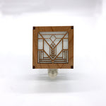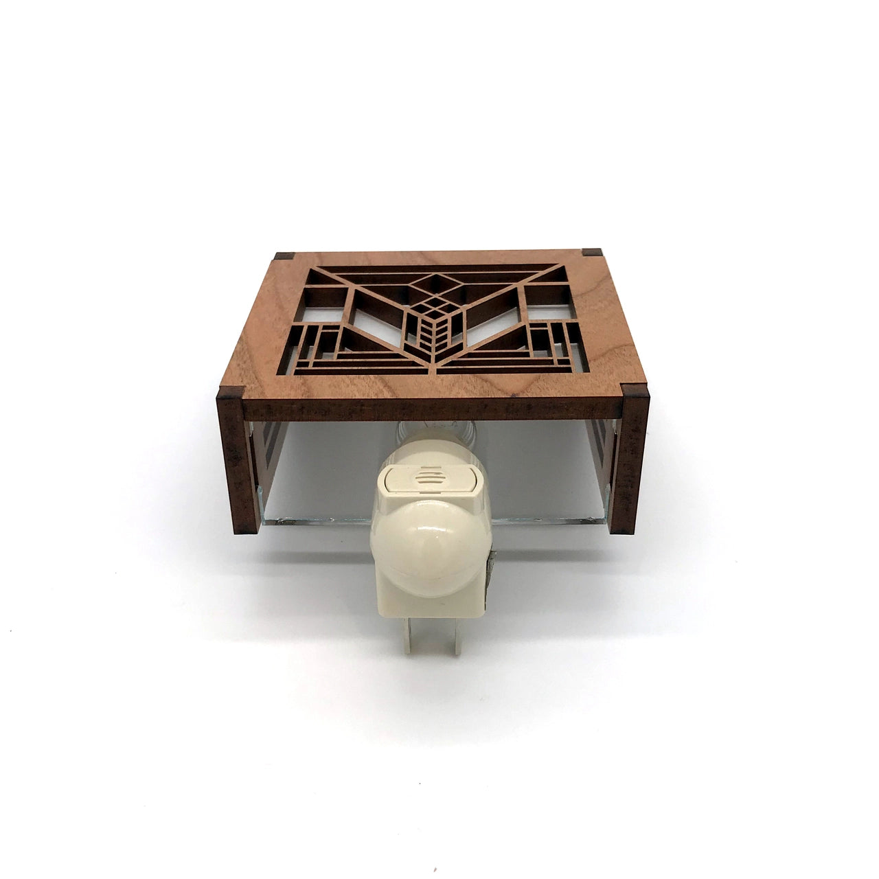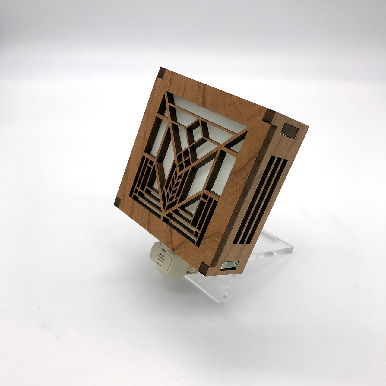 Frank Lloyd Wright night lights are made with cherry veneered MDF. This elegant night light feature slats on the top and sides with a clear acrylic bottom panel to allow more light to shine through. The base is almond colored to blend in with the cherry motif.