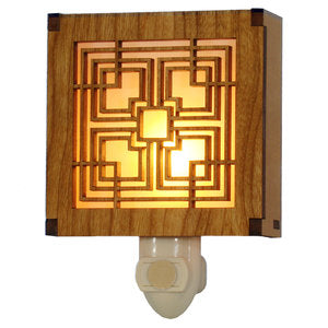 This night light is made with cherry veneered MDF. This elegant night light feature slats on the top and sides with a clear acrylic bottom panel to allow more light to shine through. The base is almond colored to blend in with the cherry motif. 4" x 4" x 1.5".