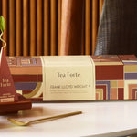 The Frank Lloyd Wright Petite Presentation Box contains 10 pyramid infusers, two of each new blend: Ceylon Gold (Black tea), Citrus Earl Grey (Black tea), Oolong Créme (Oolong tea), Honey Hojicha (Green tea) and Spiced Herbal Maté (Herbal tea). The open lid reveals a detailed tasting menu. See below for blend descriptions. Box measures 8.5L X 4.2D X 2.0H”.