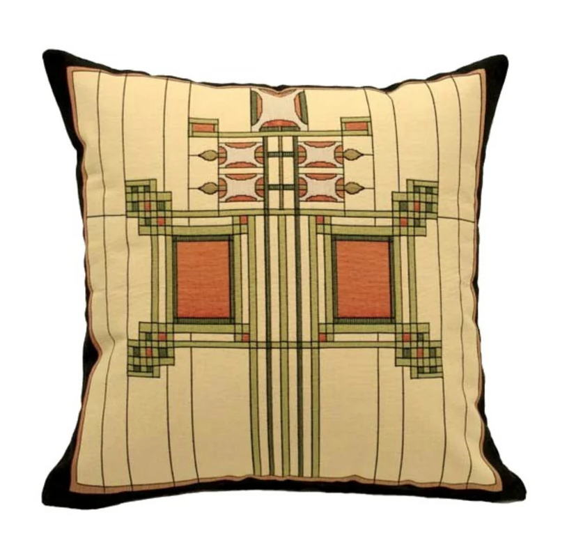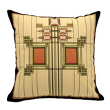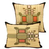 Sullivan Art Glass Lumbar Pillow is based on a window in the National Farmer’s Bank, Owatonna, Minnesota, 1908, designed by Louis Henry Sullivan, with decorative elements by George Elmslie. It was the first of Sullivan’s “jewel box” bank designs. A beautiful design from an important architect and historic building, brought to life in an extraordinary fabric with exceptional, rich colors and weaving.