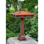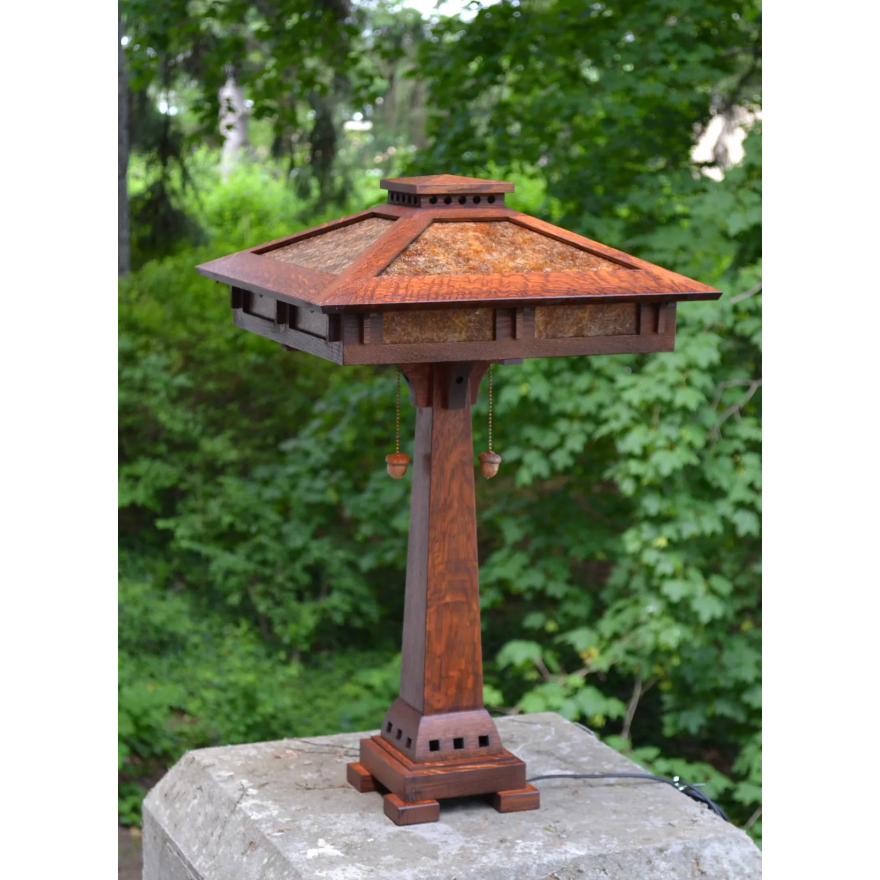 This Classic Prairie style lamp is made of carefully hand picked quarter sawn white oak, and uses genuine mica in the shade. The 2 solid brass electrical sockets are newly made in the Edison style. A patina has been carefully applied to all solid brass lamp parts so they will look old. The pull chains are 8 inches long. The lamp is a creation in the arts & crafts style. Each lamp is hand made in the USA and signed by the designer Phillip Myer.