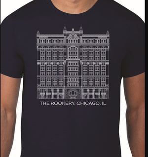 Navy t-shirt with white architectural design of The Rookery building and text 'The Rookery, Chicago, IL' on a plain background
