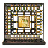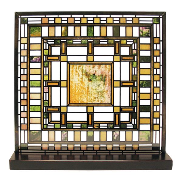 This stained glass piece was inspired by a daylight in the Darwin D. Martin House (1903) in Buffalo, NY. The glass panel is framed in metal and can be hung or sat using its wooden stand.