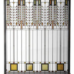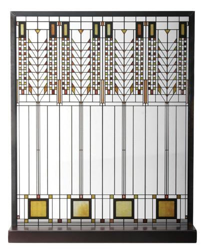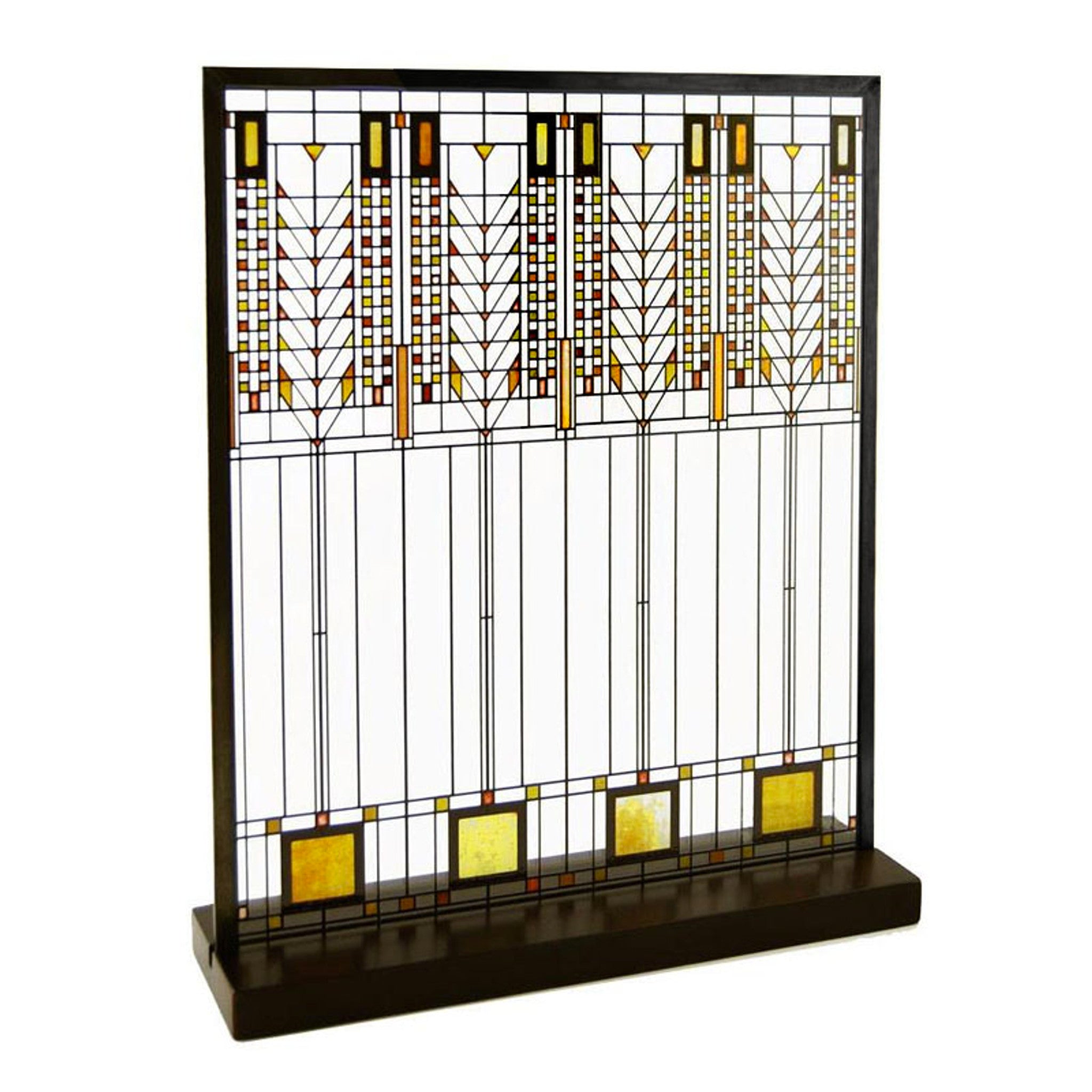One of Wright's most popular designs is adapted in this colorful glass panel. Painted with transparent enamels, kiln-fired and surrounded in a copper patina frame. Also included is a wood stand for desk or table display and a chain for hanging. 9-1/2"w x 11-3/8"h.