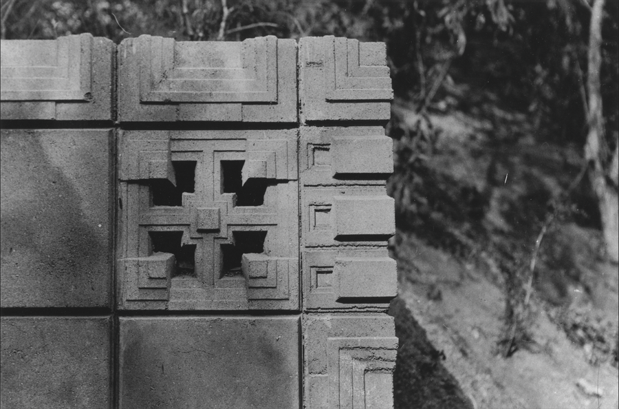 When Wright came to Southern California in the early 1920s, he began working in a design language very different from his previous projects. Like so many before and since, Wright was eager for a new start in the golden state. In January 1923, Wright opened up a small office in West Hollywood and began taking on commissions, including four houses to be constructed solely of geometric cast concrete blocks. This work gave new life to the humble concrete block with decorative bas-reliefs and a new building system he called “textile block construction,” a reference to his idea of weaving concrete blocks on the warp and weft of reinforced steel, forming an interlocking system for the “fabric” of the house. By using hand-cast blocks using raw materials found on the property, he blended the house with the color and form of the trees and hillside.