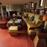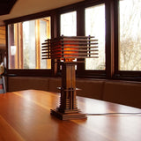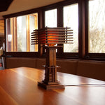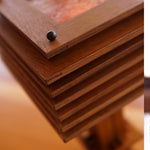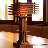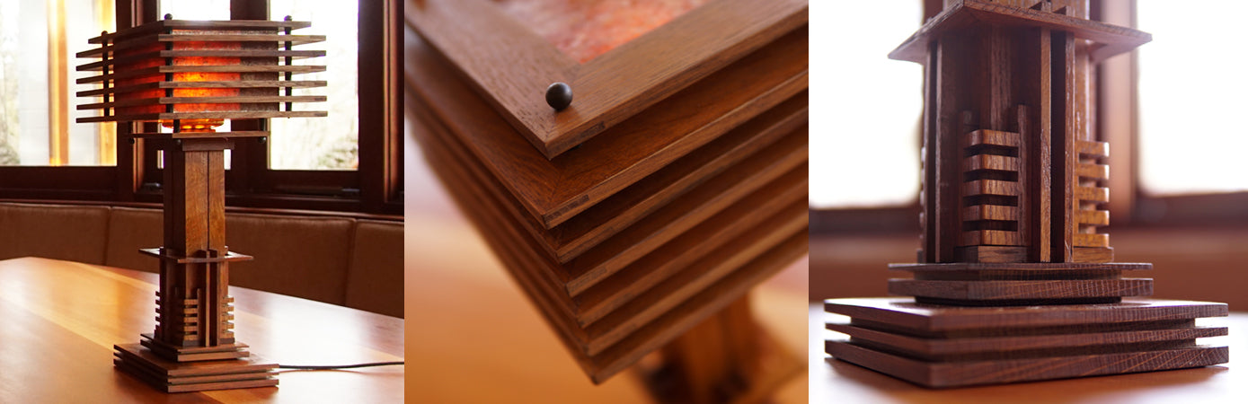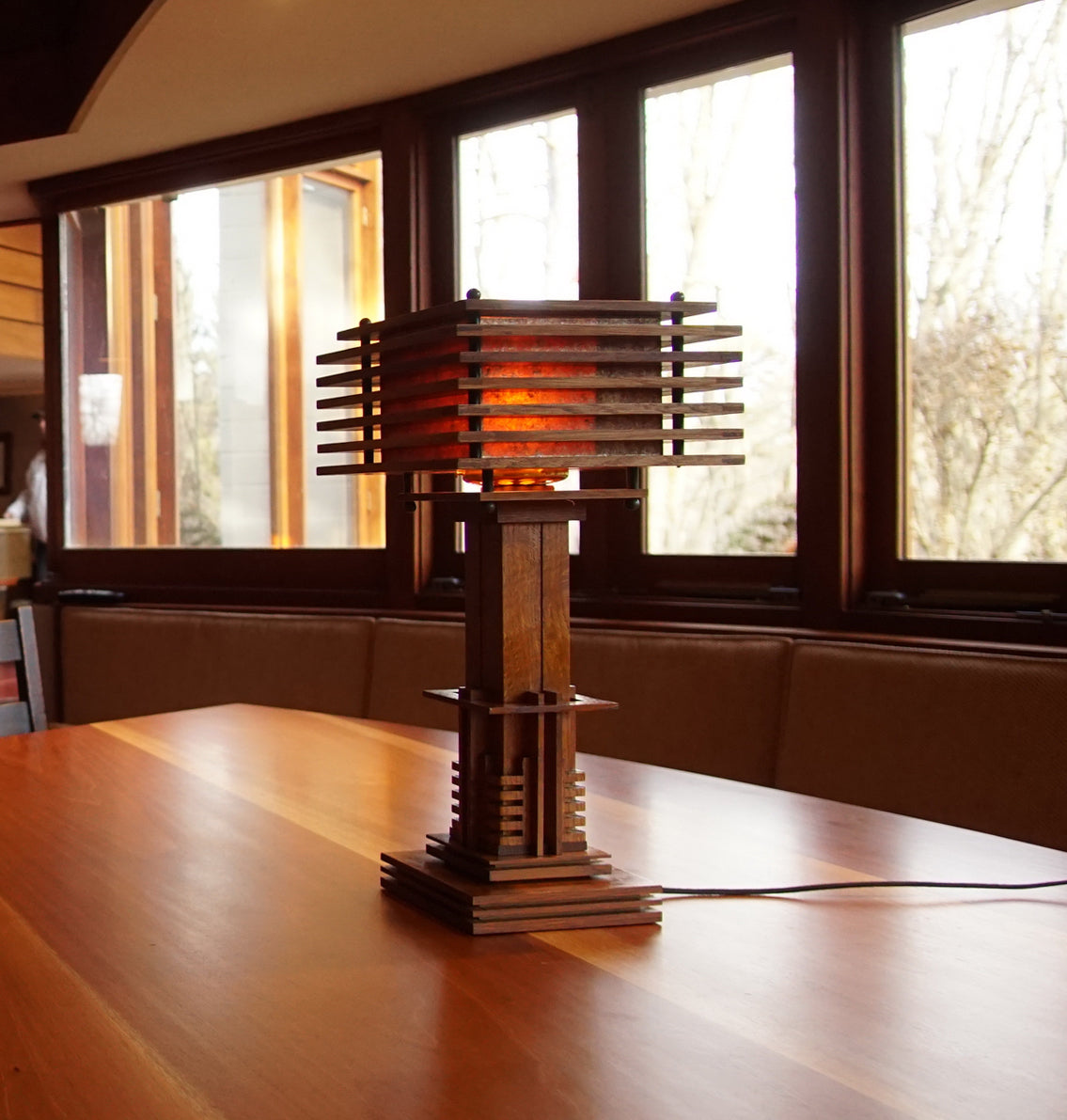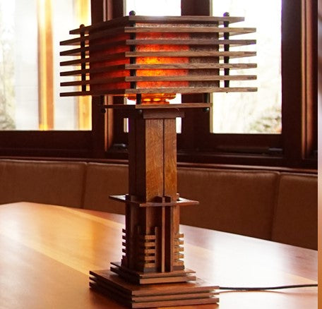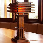 The artist who created this intriguing lamp describes it as a fusion of Mid-Century Modern and traditional Arts & Crafts designs. It is carefully crafted of hand-picked quarter-sawn white oak, with a fumed Nut Brown stain, and genuine amber mica panels in the shade. A 3-way LED bulb is supplied.
