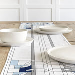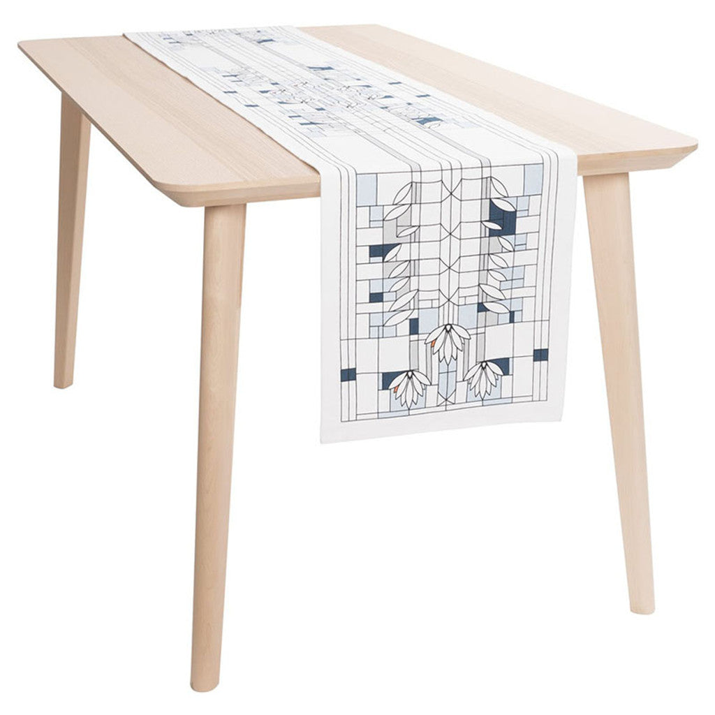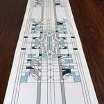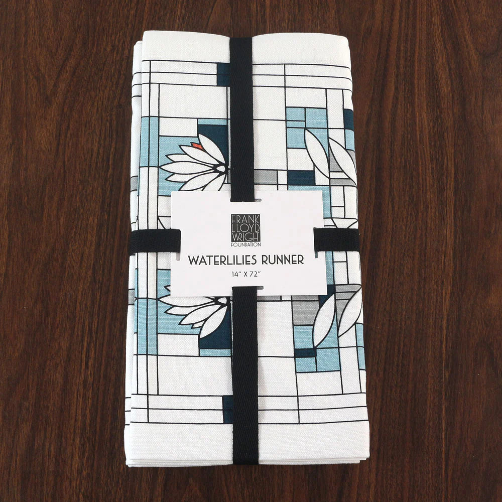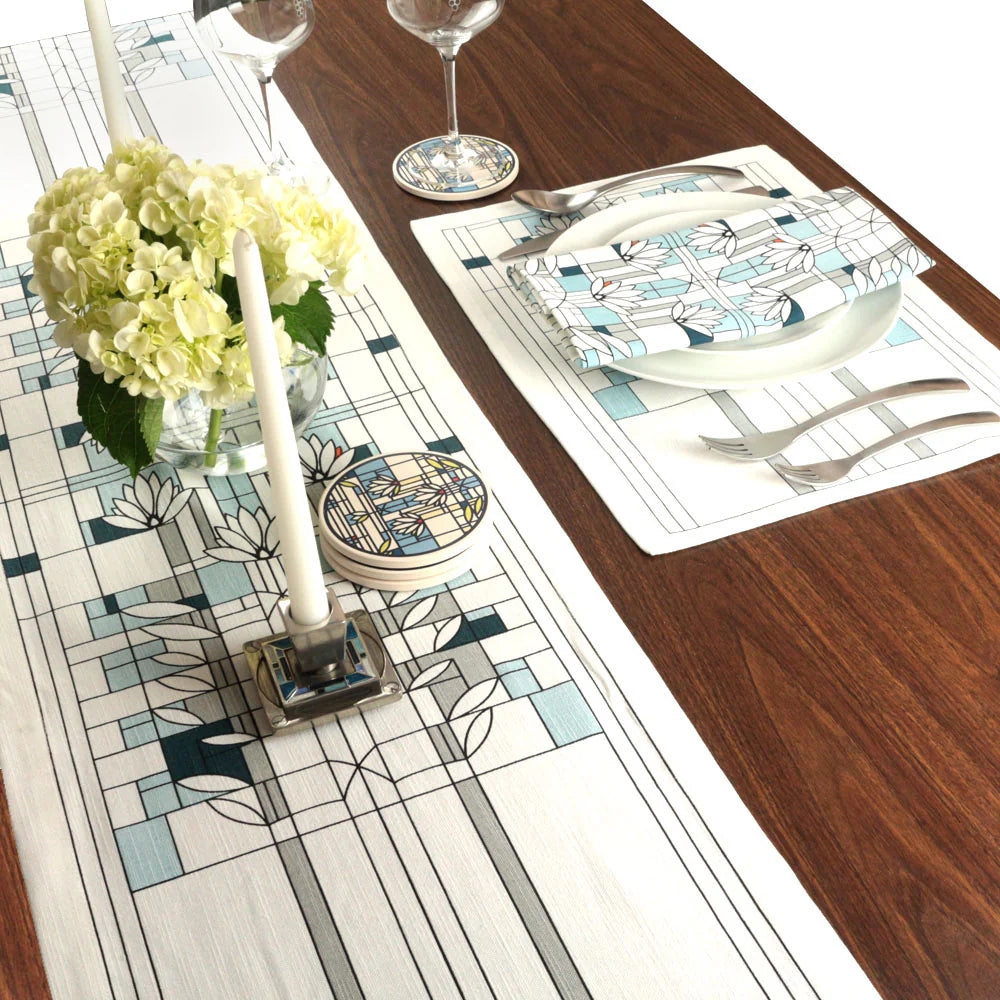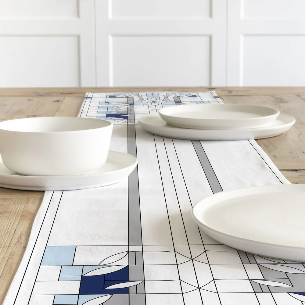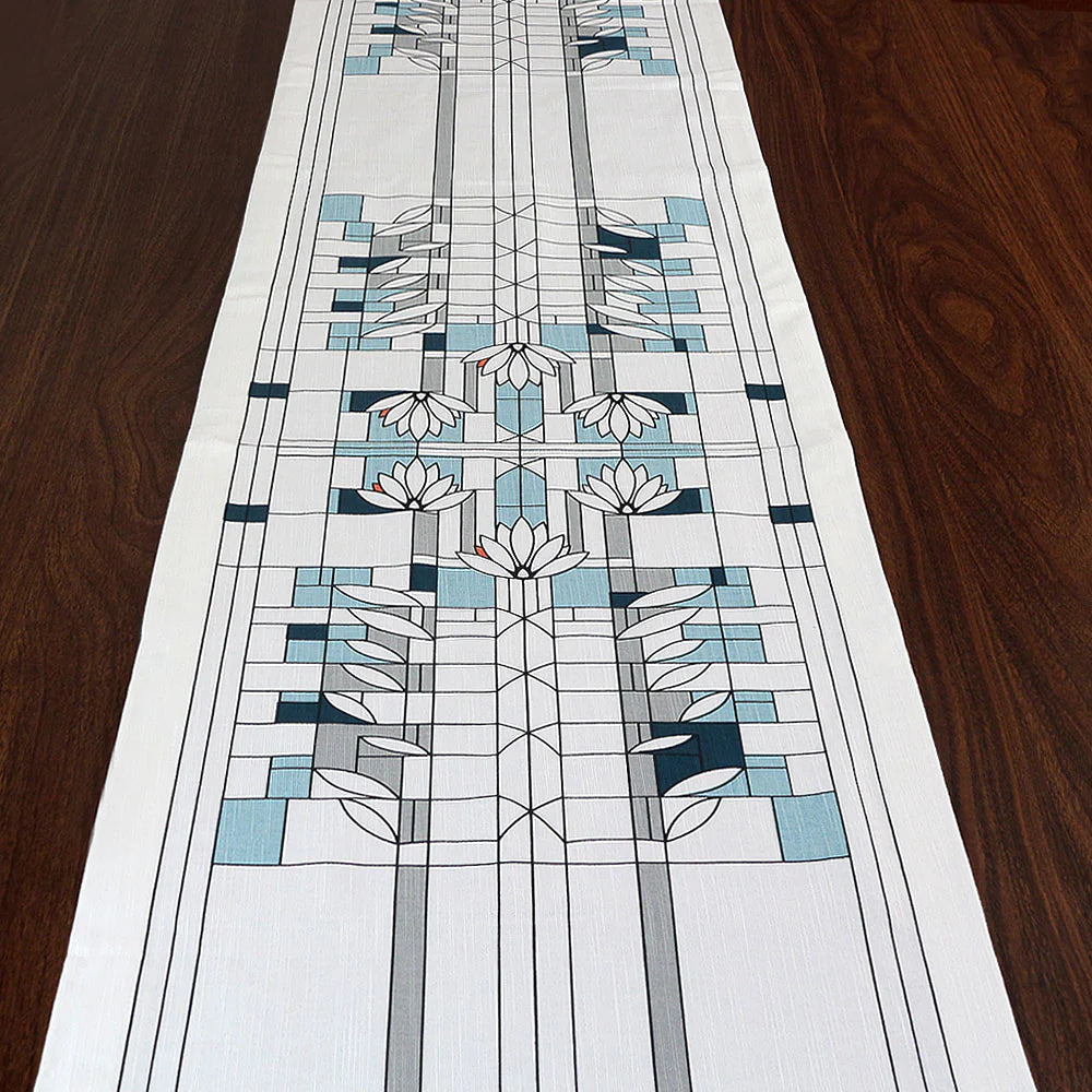 This printed runner, inspired by the iconic architect Frank Lloyd Wright, features flowing patterns that elevate any tabletop setting with modern elegance.