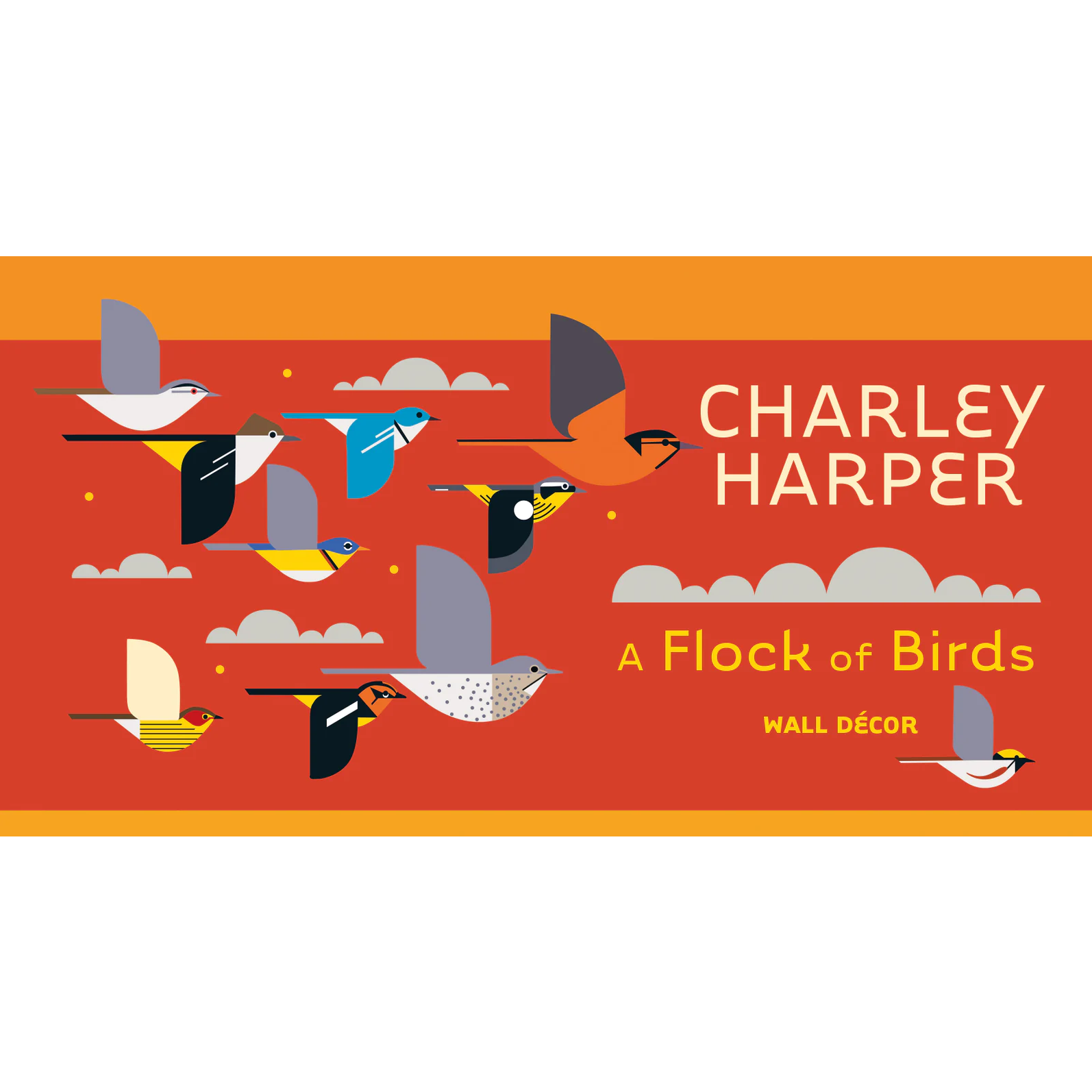 Vibrant wall stickers based on Harperâs Mystery of the Missing Migrants let art and animal lovers bring this geometric avian arrangement indoors. Includes 26 glossy bird stickers of varying sizes (about 3 to 5 inches tall), a list of each bird, plus 32 additional stickers of clouds, stars, and more. The arrangement is fully customizable and can be applied to any smooth surface.